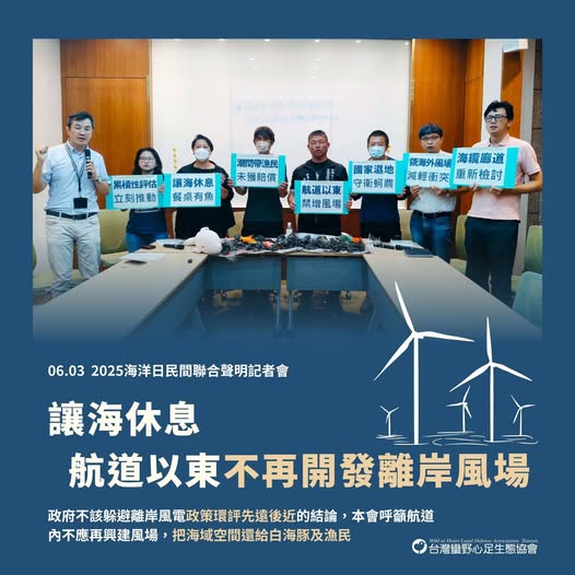 彰化風場航道以東、原潛力場址28號的海峽風場一期已於今(2025)年4月被經濟部撤銷行政契約。時值離岸風電3-3期選商草案即將公布之際,關心海洋生態與漁業的民間團體聯合呼籲,離岸風電區塊開發政策環評「先遠岸,後近岸」的結論不但要落實,更應進一步停止開發彰化風場航道與南北通行航道以東的海域:海要休息,留下一片自由、開放的海,讓海洋環境、海洋生物與沿岸漁業有機會喘口氣。